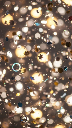 A dynamic abstract background filled with scattered golden and silver confetti and soft, glowing bokeh lights, creating a festive and celebratory atmosphere.