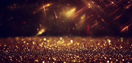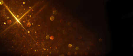 Golden bokeh lights on black background. Christmas and New Year concept.