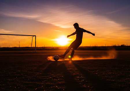A silhouette of a soccer player is captured in the act of kicking a soccer ball during a vibrant sunset. The player is positioned centrally, with the ball close to their feet, and the setting sun casting a warm, golden glow across the field. The soccer goal is visible in the background, adding depth to the scene. The image conveys a sense of motion and the beauty of the sport.