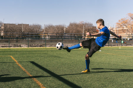 Teenager kicking a soccer ball in a city park, bottom view. Outdoor sport activity. Dynamic photo. Generative AI.