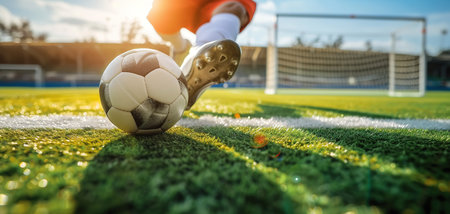 Powerful kick moment captured close-up, showing football boot connecting with ball on turf, emphasizing strength, precision, and energy