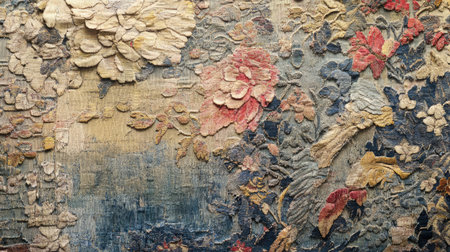 A close-up view of a vintage floral pattern reveals an intricate texture with faded colors, showcasing the beauty of aged art and decorative elements.