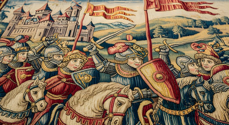 A close-up of a medieval tapestry depicting a vibrant battle scene. Knights in full armor on horseback charge forward with swords and shields raised, with a castle visible in the background. The detailed woven texture of the fabric is visible, capturing a historical moment of chivalry and warfare.