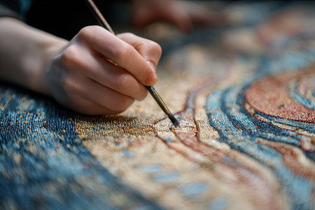 Close-up view of a hand meticulously painting a tapestry with a paintbrush. The tapestry exhibits a rich pattern and texture, with various shades of color, and the is concentrated on their work. The focus is on the intricate details of the restoration process.