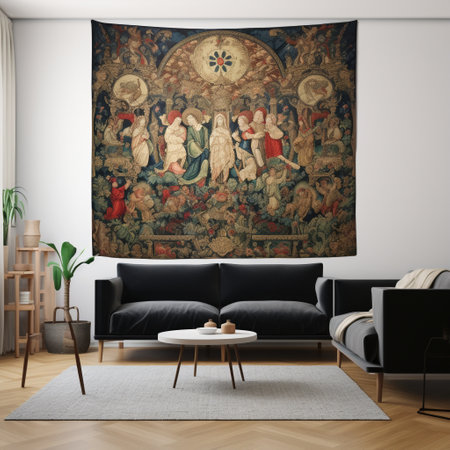 Immerse yourself in the intricate and diverse religious narratives depicted in this visually captivating wallpaper tapestry titled 'Tapestry of Tales - Wall Hanging Depicting Religious Stories.' This stunning artwork portrays various art styles, including hyper-realism, vibrant cartoon illustrations, minimalistic line drawings, and expressive abstract paintings. Each style is carefully juxtaposed to create a captivating visual experience that brings to life the essence of religious tales from different cultures. The tapestry showcases impactful scenes, iconic symbols, and spiritual metaphors, evoking a sense of wonder and interweaving cultural heritage. With its vibrant colors and intricate details, this tapestry is sure to inspire viewers from all walks of life.