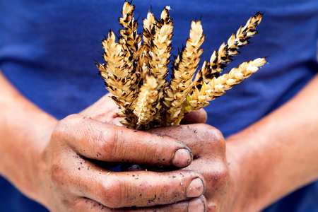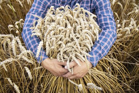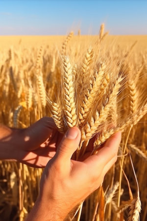 Wheat crops in a farmers hands, showcasing the golden grains, isolated against a clear blue sky
