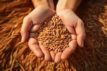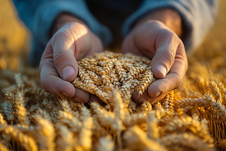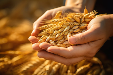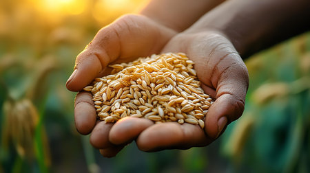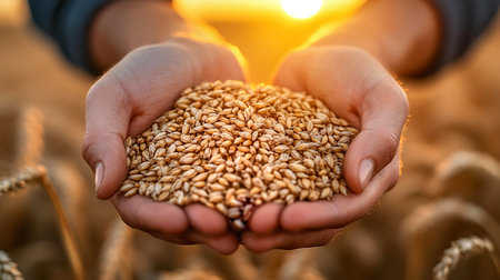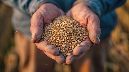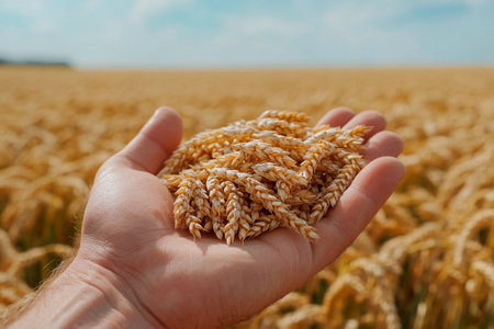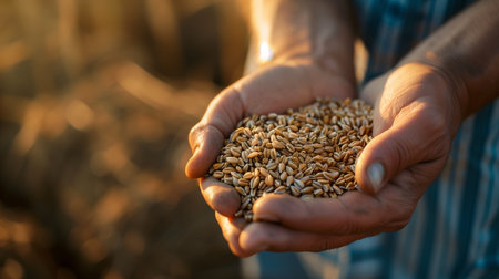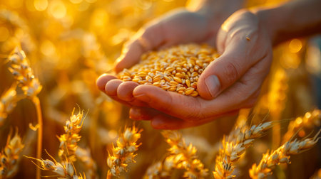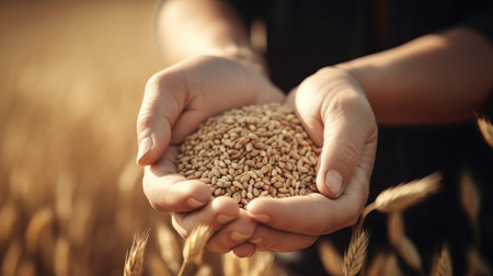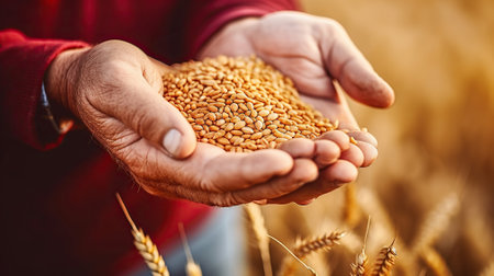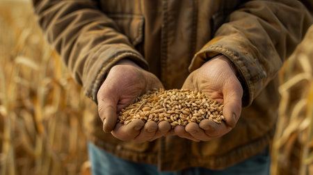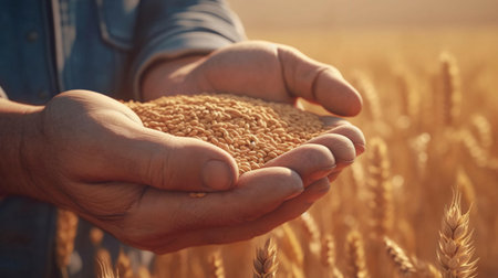 Close up of a farmer hand cradling a handful of ripe golden wheat grains, with a blurred wheat field in the background, representing abundance and food production.