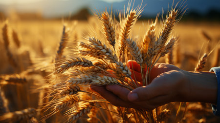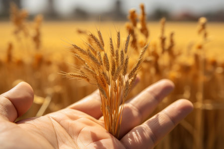 Farmer hand holding golden wheat grains, with a blurred field in the background. represents harvest, agriculture, food, and natural abundance.