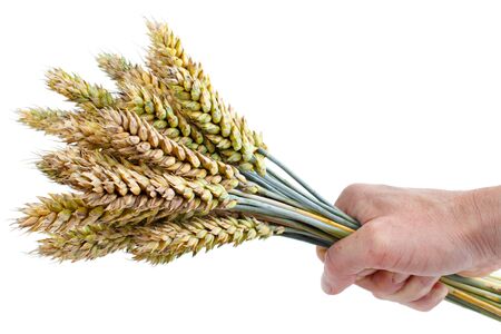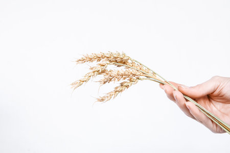 Woman holds golden spikelet wheat crop in hand on white background. Harvesting grain, agriculture, and natural food ingredient concept. Minimalist design.