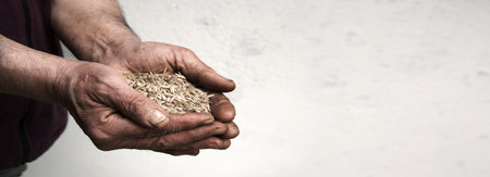 Close up of male hands holding small amount of wheat seeds. Lack of food and hunger concept