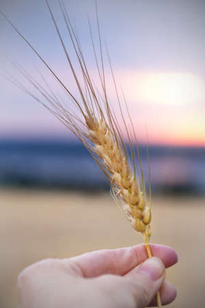 A man holds golden ears of wheat against the background of a ripening field. Farmer's hands close-up. The concept of planting and harvesting a rich harvest. Rural landscape at sunset.