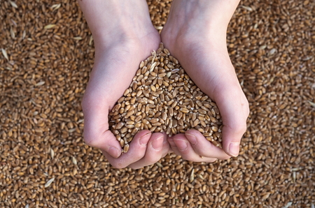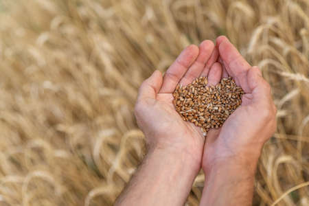 Harvest, close up of farmer's hands holding wheat grains against the background of grain