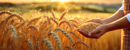 Hands cradle a bounty of wheat on golden field. The harvest is ripe, symbolizing nutrition and growth. The warmth of the sunset highlights the richness of the grains. Panorama with copy space.
