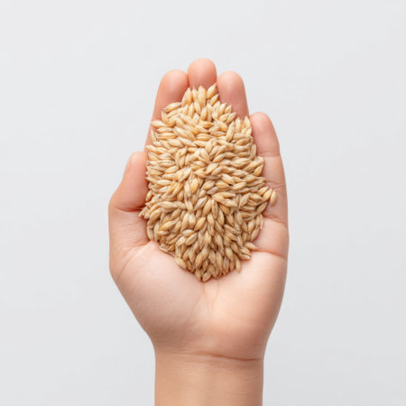 A close-up image of a hand holding a pile of raw oats against a simple background, symbolizing health, wellness, and nutritional benefits in food preparation.