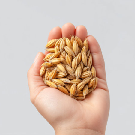 A closeup image of a hand holding an assortment of grains, showcasing their natural texture and organic quality against a light backdrop. Perfect for agricultural themes.
