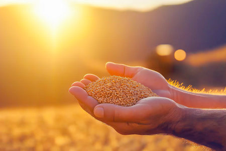 Close-up image of hands holding wheat grains against a golden farmland backdrop. The soft sunlight and warm tones evoke a sense of harvest and abundance in rural settings.