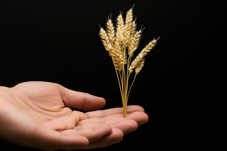 Close-up shot of a hand presenting wheat ears isolated on a dark backdrop