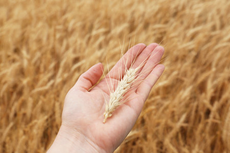 A farmer's hand holding a bundle of golden wheat ears against a sunny field background.