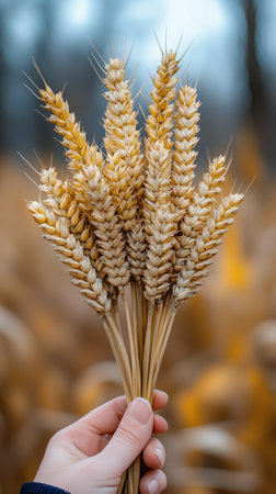 Close-up of a hand cradling ripe wheat ears with a blurred field backdrop