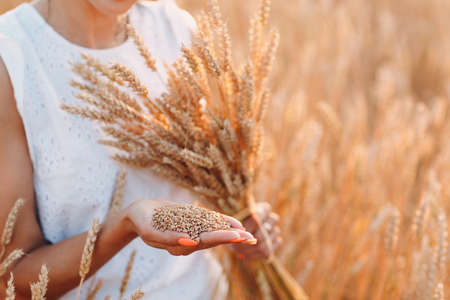 Girl in hands holds wheat grains among wheat field, hot summer day