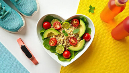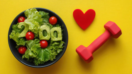 Brightly colored salad featuring fresh tomatoes and lettuce, alongside a red dumbbell and heart symbol, illustrating a healthy lifestyle and fitness journey.