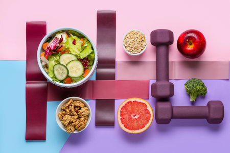 Healthy lifestyle and nutrition eating concept. Food with sports fitness equipment
