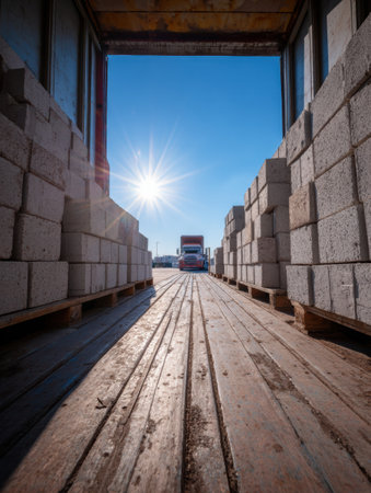 Concrete blocks are stacked inside a freight truck, ready for transport, as the sun shines brightly in a clear sky.