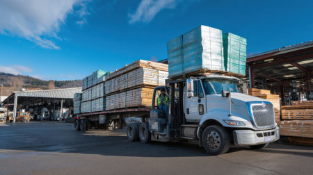 Forklift loads building materials onto a truck at a construction site during daytime with a clean blue sky in the background.