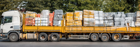 Truck cab with a trailing trailer is filled with construction supplies while leaving space clear for additional loads on a sunny street.