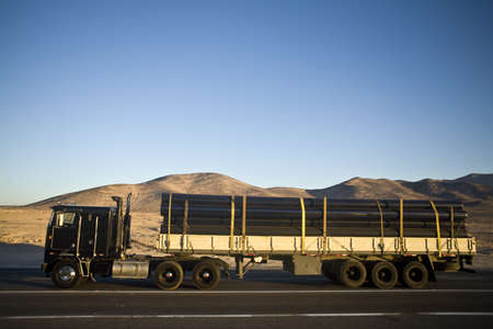 Building materials truck loaded with steel beams. Oversize load length restrictions concept