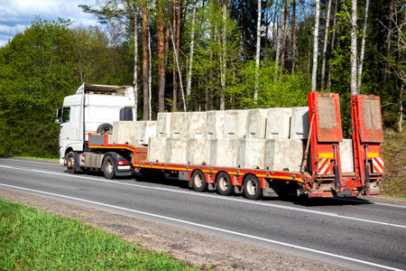 A white truck with a lowboy semitrailer transports concrete products along a country road against a forest background. Oversized cargo, industry