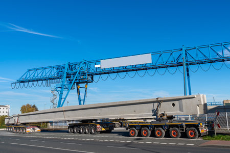 Overhead crane and trailer with long concrete beams against the blue sky. On the side of the road.