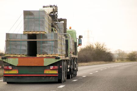 Taman, Russia - July 9, 2019: Transportation of blocks of limestone shell by the truck.