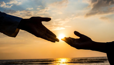 Silhouette of hands reaching for each other on the beach at sunset