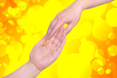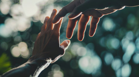 Help concept hands reaching out to help each other with bokeh background.