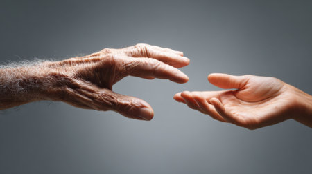 An older hand meets a younger hand in a tender gesture highlighting family bonds and care.
