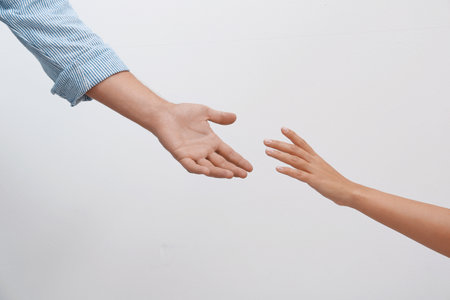 Man and woman giving each other hands on light background. Concept of support and help