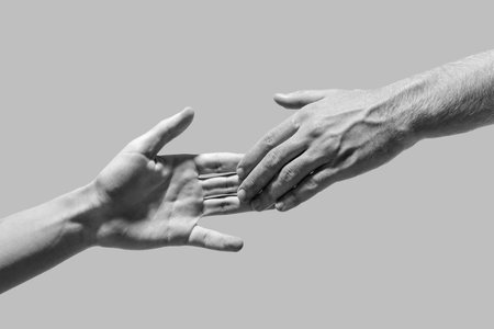 Concept photo of a hand reaching out to help a smaller hand, illustrating the idea of an elder mentor helping to guide a younger individual on their spiritual path