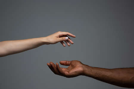 Touch of God. Racial tolerance. Respect social unity. African and caucasian hands gesturing on gray studio background. Human rights, friendship, intenational unity concept. Interracial unity.