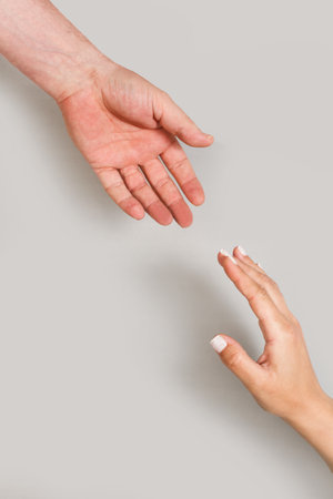 Woman and man hands trying to hold each other on a gray background with copy space