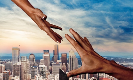 Hands reaching out to each other against a bright sky