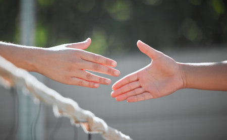 Tennis, shaking hands and sports court competition, challenge and welcome to start outdoor team games. Badminton training, handshake and collaboration, motivation and partnership for meeting athlete