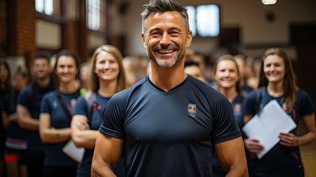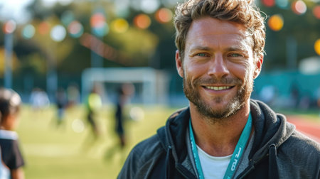 Enthusiastic physical education teacher on a sports field, highlighting active learning and sportsmanship.