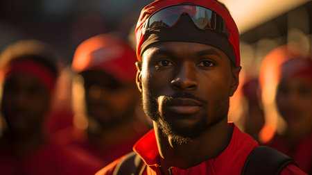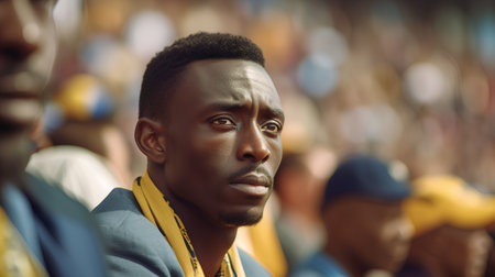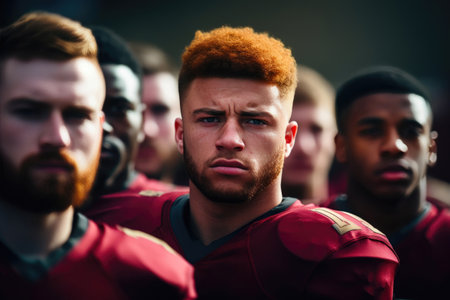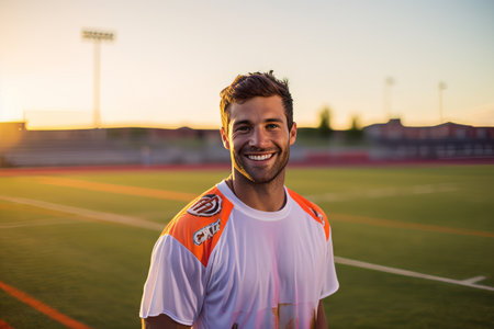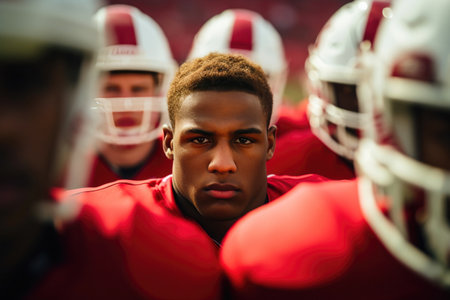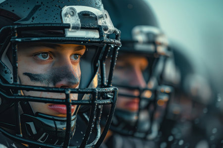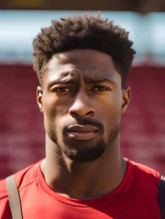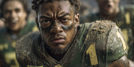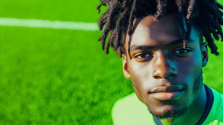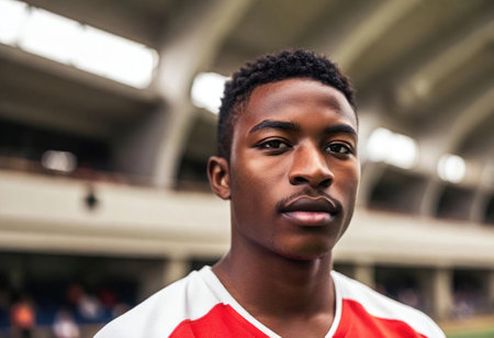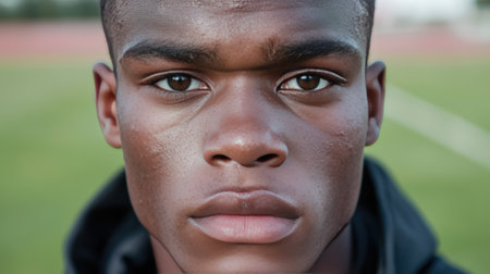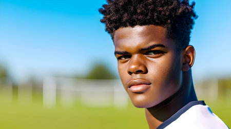 Close-up portrait of a young male football player, showcasing a focused and determined expression. The athlete embodies passion and commitment to the sport, a true competitor.