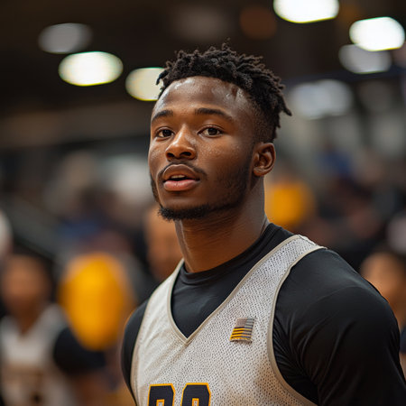 A young basketball athlete wearing a uniform looks prepared on the court under dynamic game lighting.