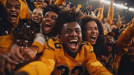 Intense scene of ecstatic rugby fans in red cheering passionately in a crowded night-time stadium setting filled with energetically charged emotions.