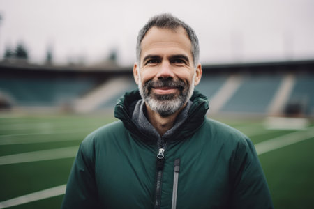 Handsome middle-aged man in sportswear smiling at camera while standing on football stadium