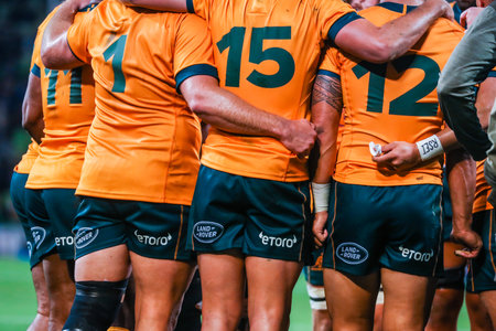 Rugby players huddling together before a night match, braving heavy rain and muddy conditions, showcasing teamwork and determination