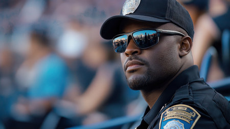 A police officer wearing sunglasses and a black hat stands in front of a crowd. The officer is wearing a badge that says Police on it