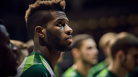 Young male athlete with serious expression reflecting on performance in a gymnasium setting, focused gaze, dynamic sports atmosphere, indoor basketball scene